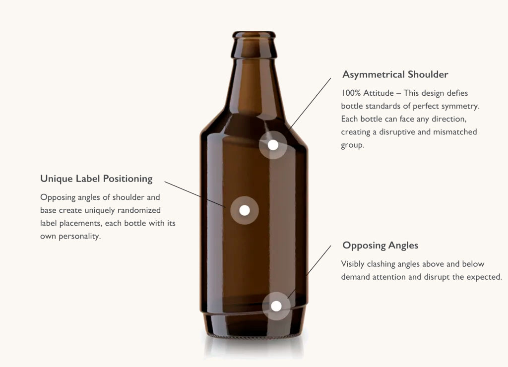 A revolutionary beer bottle design, the Misfit pushes all boundaries. Featuring an asymmetrical shoulder, unique label positioning and opposing angles, the design rejects traditional profiles. These elements perpetuate a defiant motive with a striking shelf presence sure to differentiate from the ordinary.