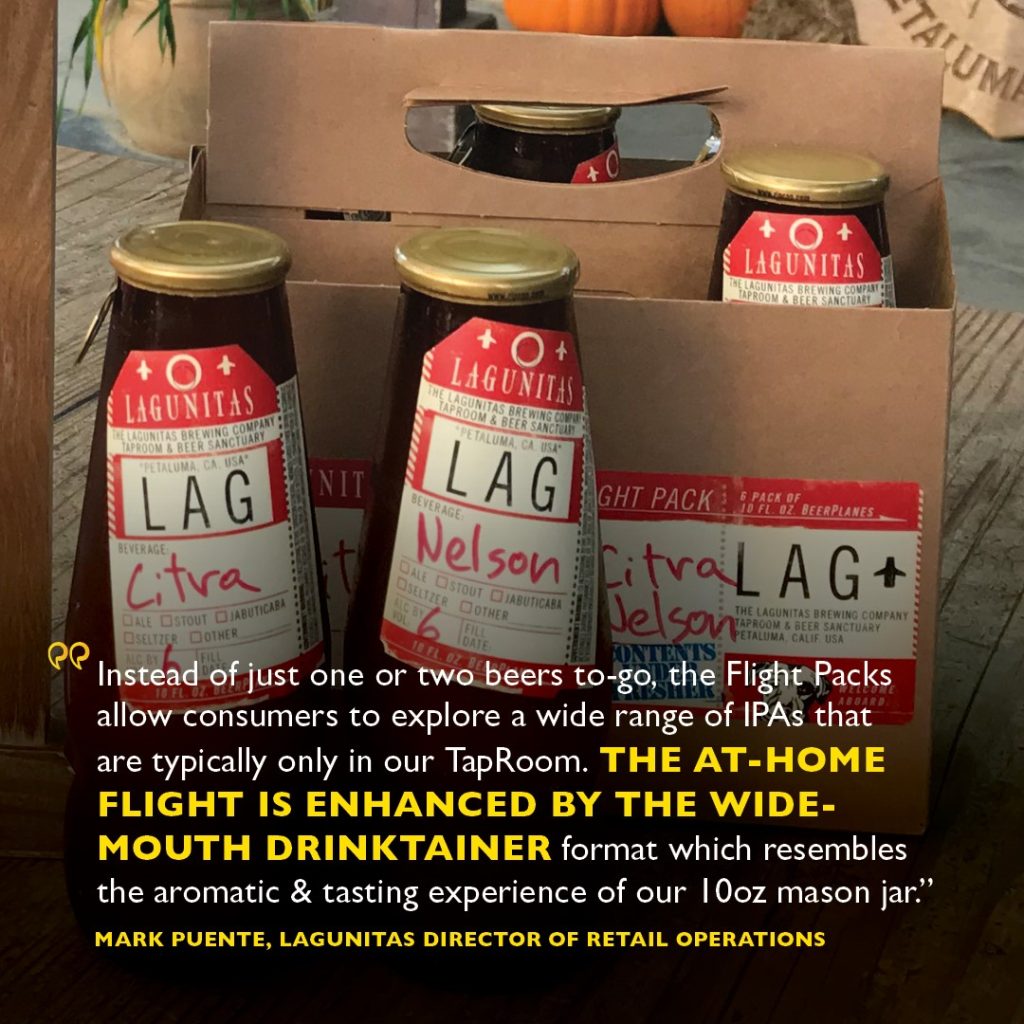 “Instead of just one or two beers to-go, the Flight Packs allow consumers to explore a wide range of IPAs that are typically only in our TapRoom,” says Mark Puente, Director of Retail Operations at Lagunitas. “The at-home flight is enhanced by the wide-mouth Drinktainer format which resembles the aromatic and tasting experience of our 10oz mason jar.”